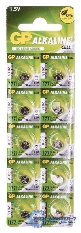 Zestaw 10 baterii alkalicznych LR626 o napięciu: 1.5 V. Pojemność: 12 mAh. Wysokość: 2.6 mm. Średnica: 6.8 mm.